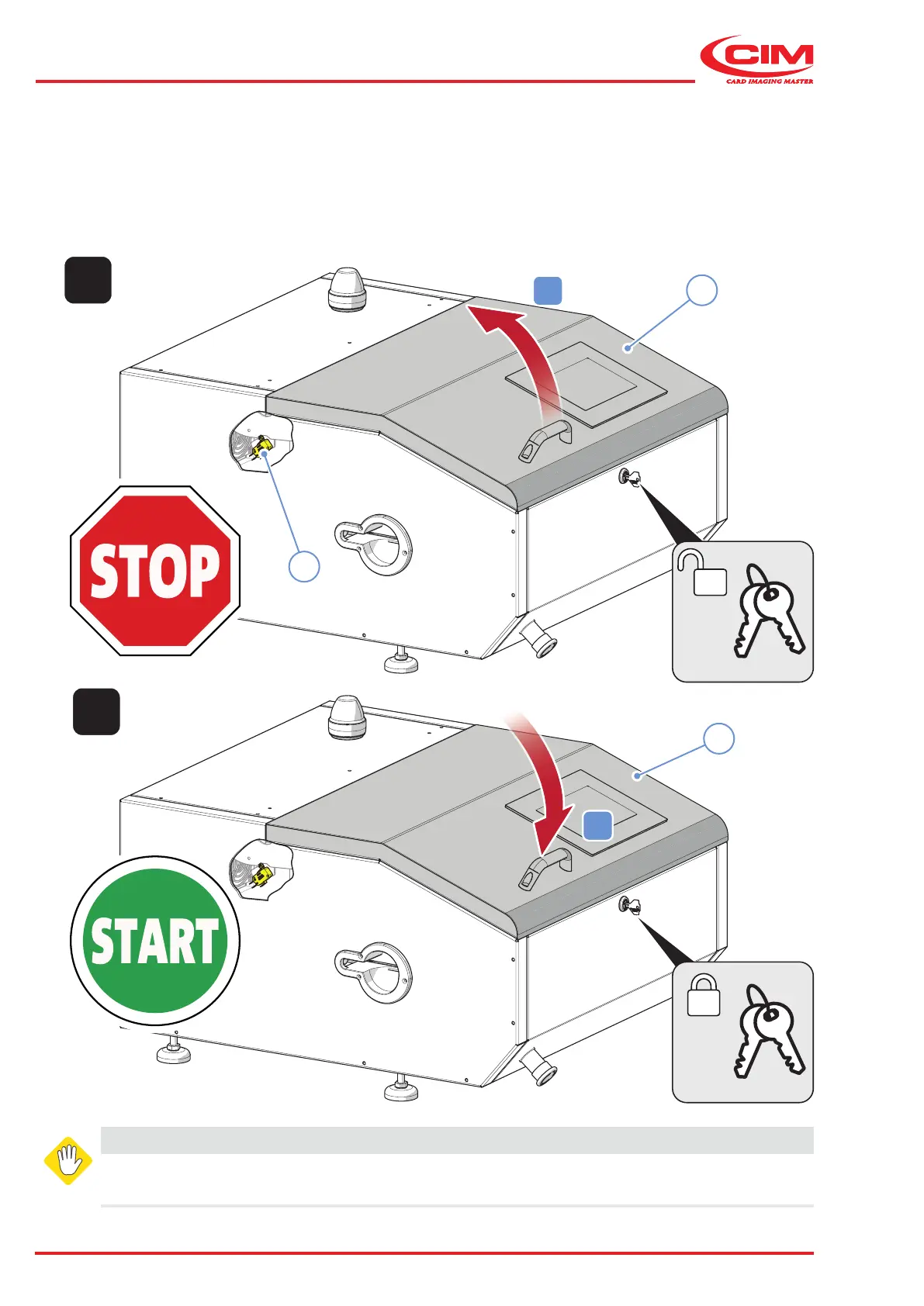 The guard (1) must be closed (B) and the machine reset in order to resume processing.