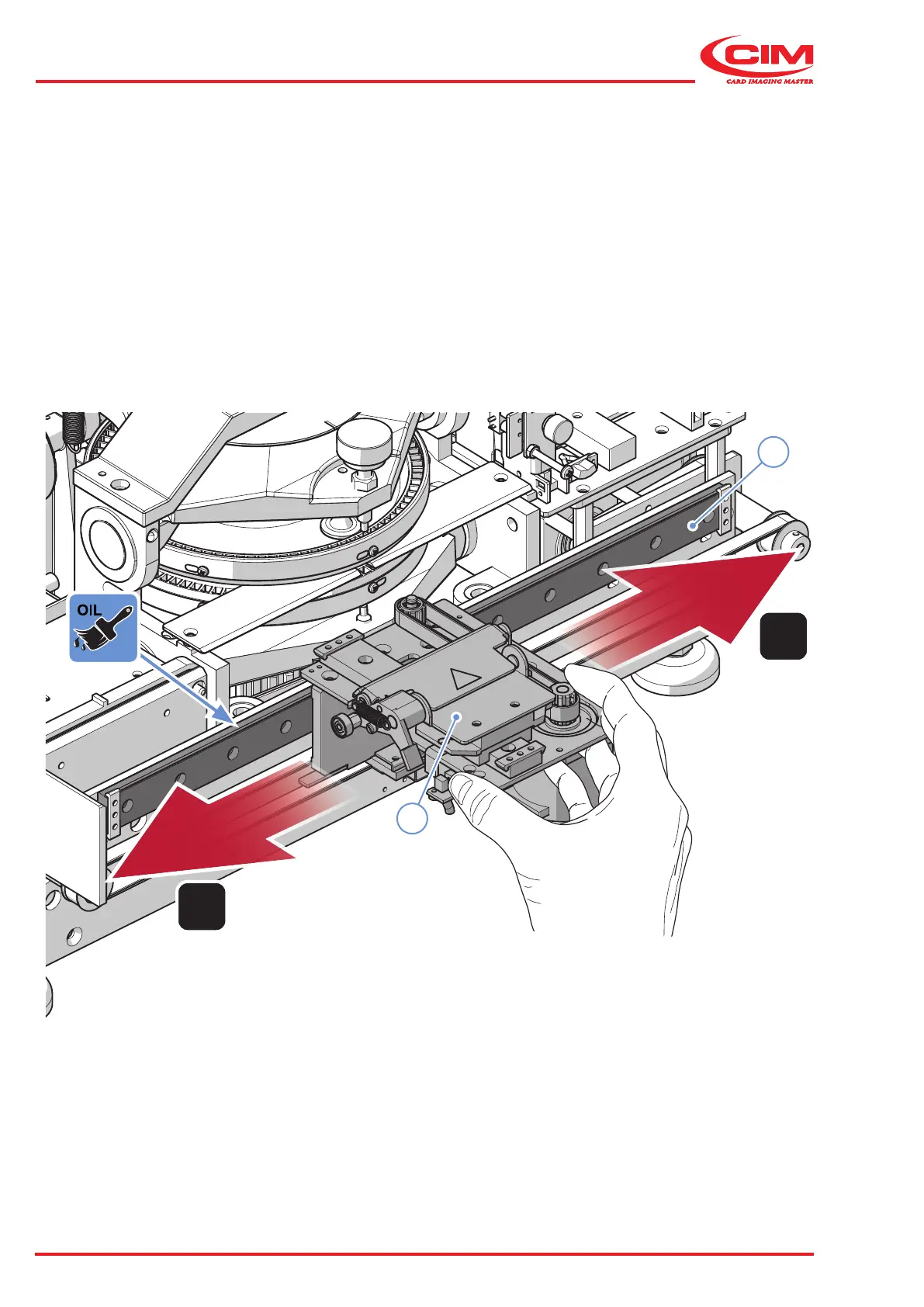 Then move (A) the carriage (2) by hand to distribute the oil evenly and make sure that the carriage runs smoothly.