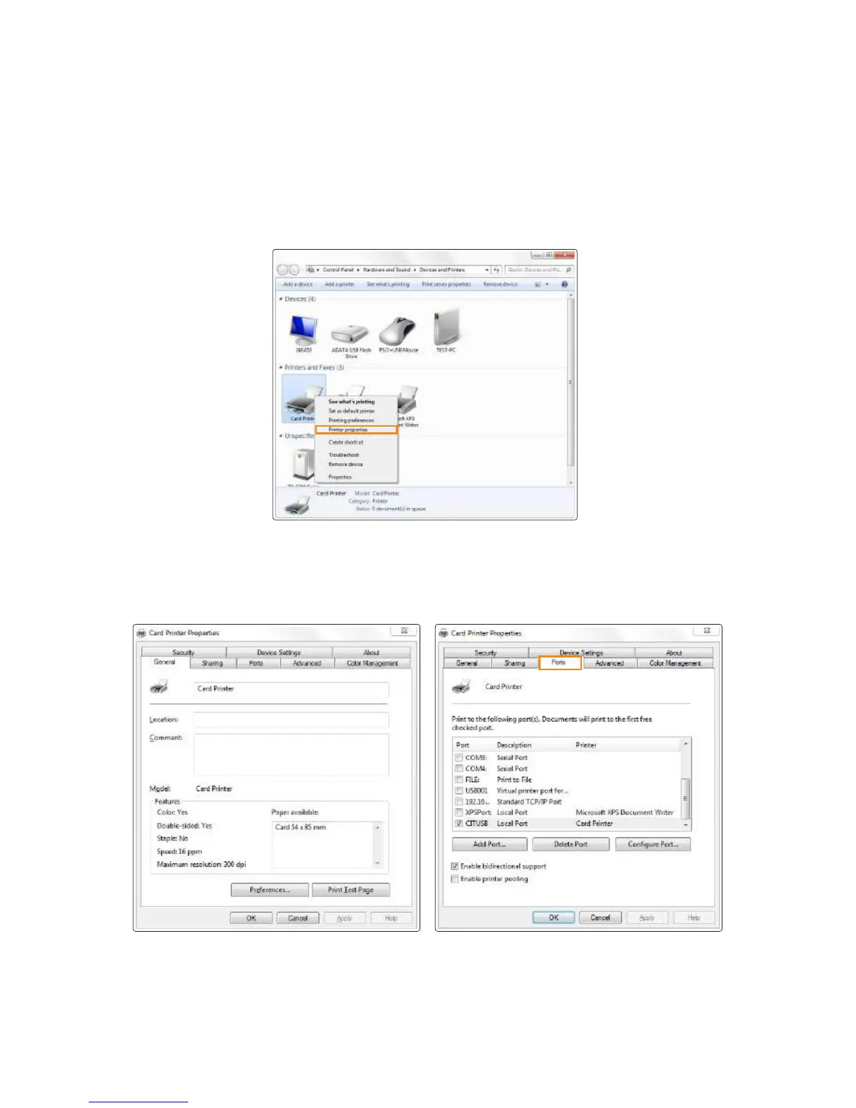 2. Right-click “Card Printer” and select “Properties (or Printer Properties)”.