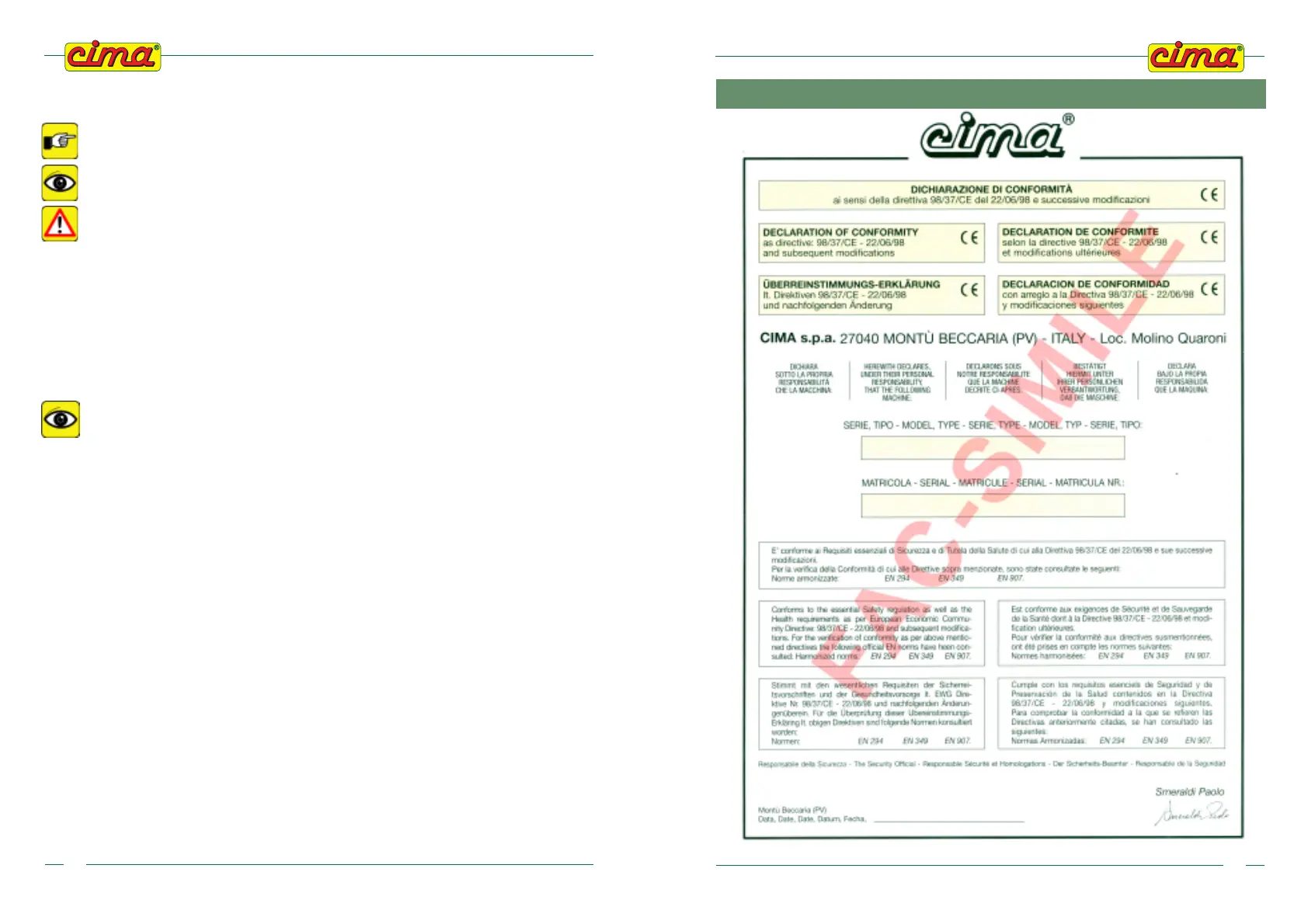 Should the machine be sold, the owner must inform the new purchaser that he should notify C.I.M.A