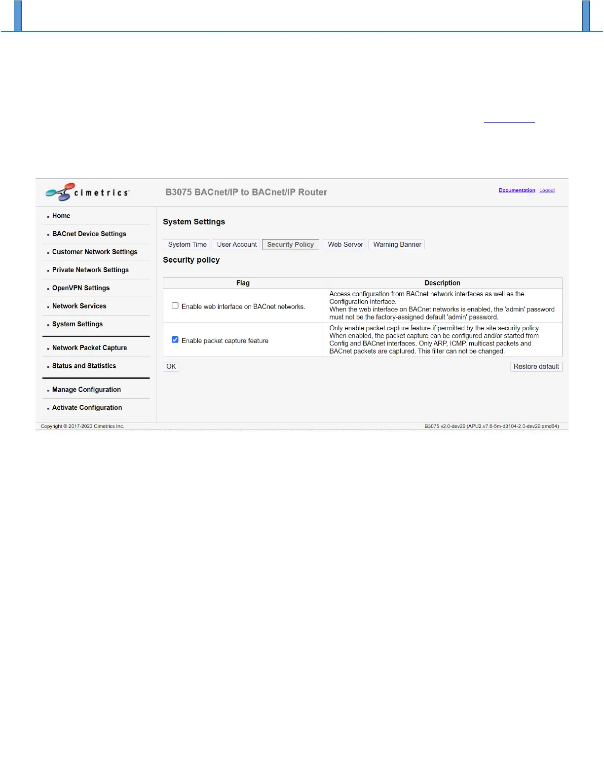 using the checkbox “Enable packet capture feature” on the System Settings web page, Security Policy tab.