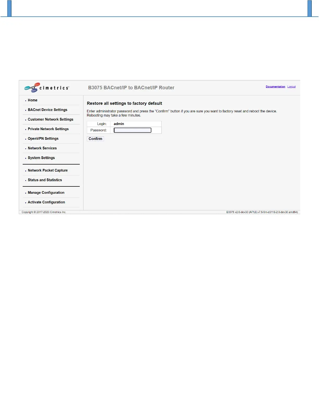 Once you enter the current admin password and then click on the “Confirm” button, the B3075’s current