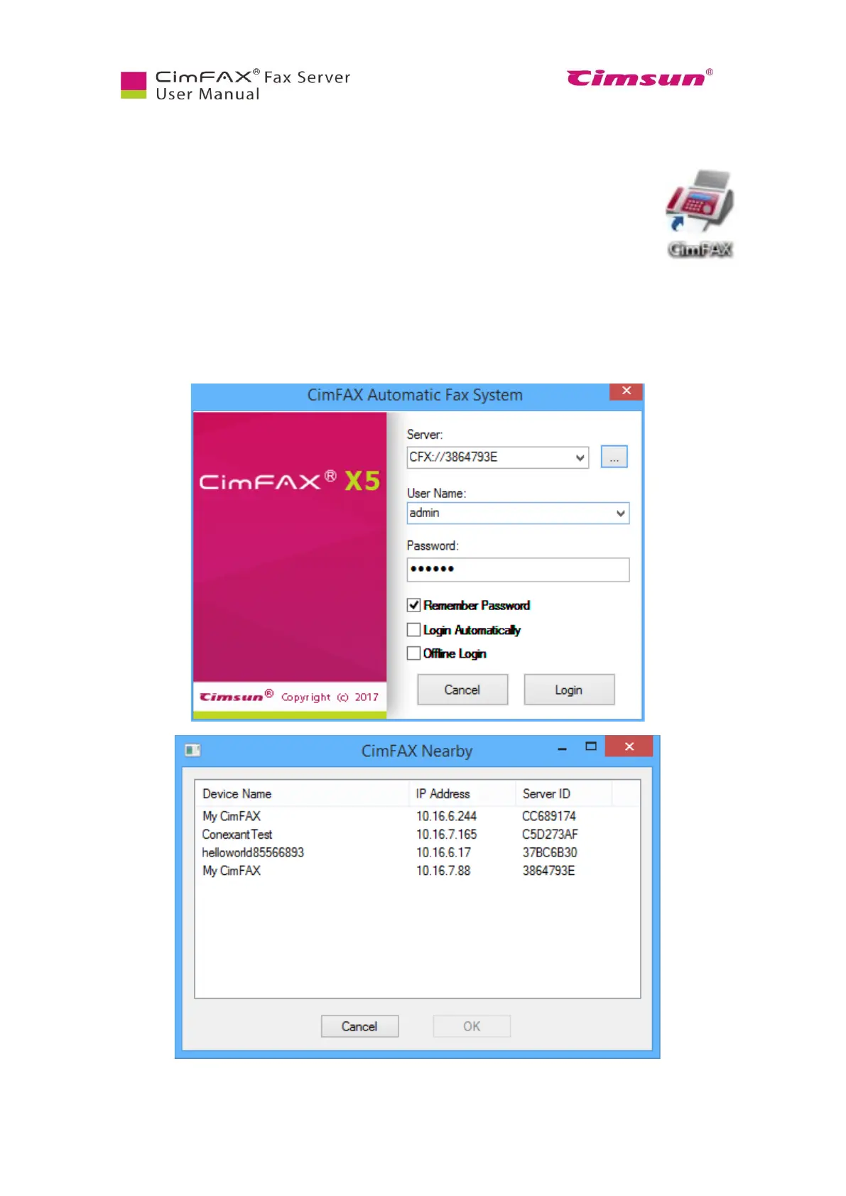 firewall alert, unblock it. The pop-up window shows basic information including CimFAX fax server ID