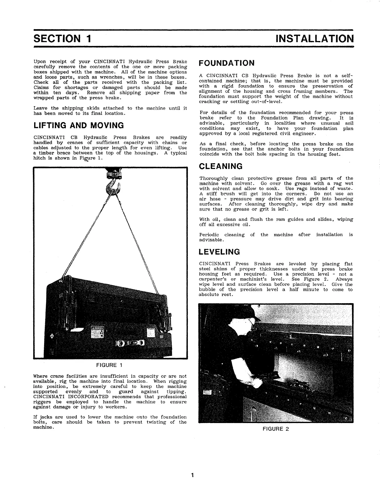 Cincinnati CB Series - SECTION 1 INSTALLATION; LIFTING AND MOVING; FOUNDATION AND CLEANING; LEVELING