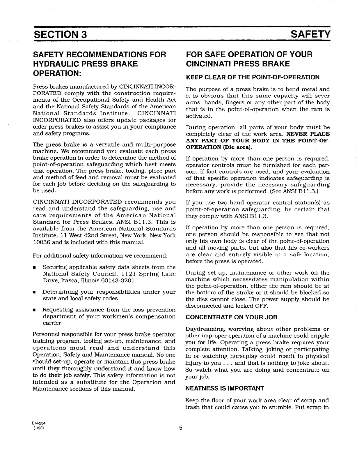 Cincinnati CB Series - SECTION 3 SAFETY; SAFETY RECOMMENDATIONS FOR OPERATION; POINT-OF-OPERATION SAFETY