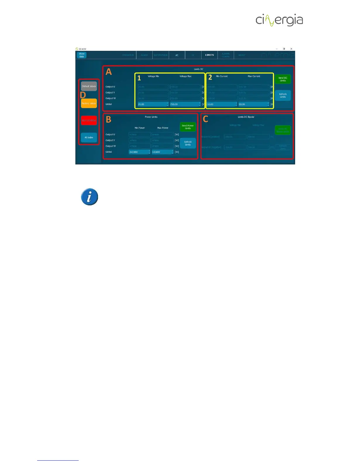 - B: Power limits. The user can set the maximum and minimum limits for each phase