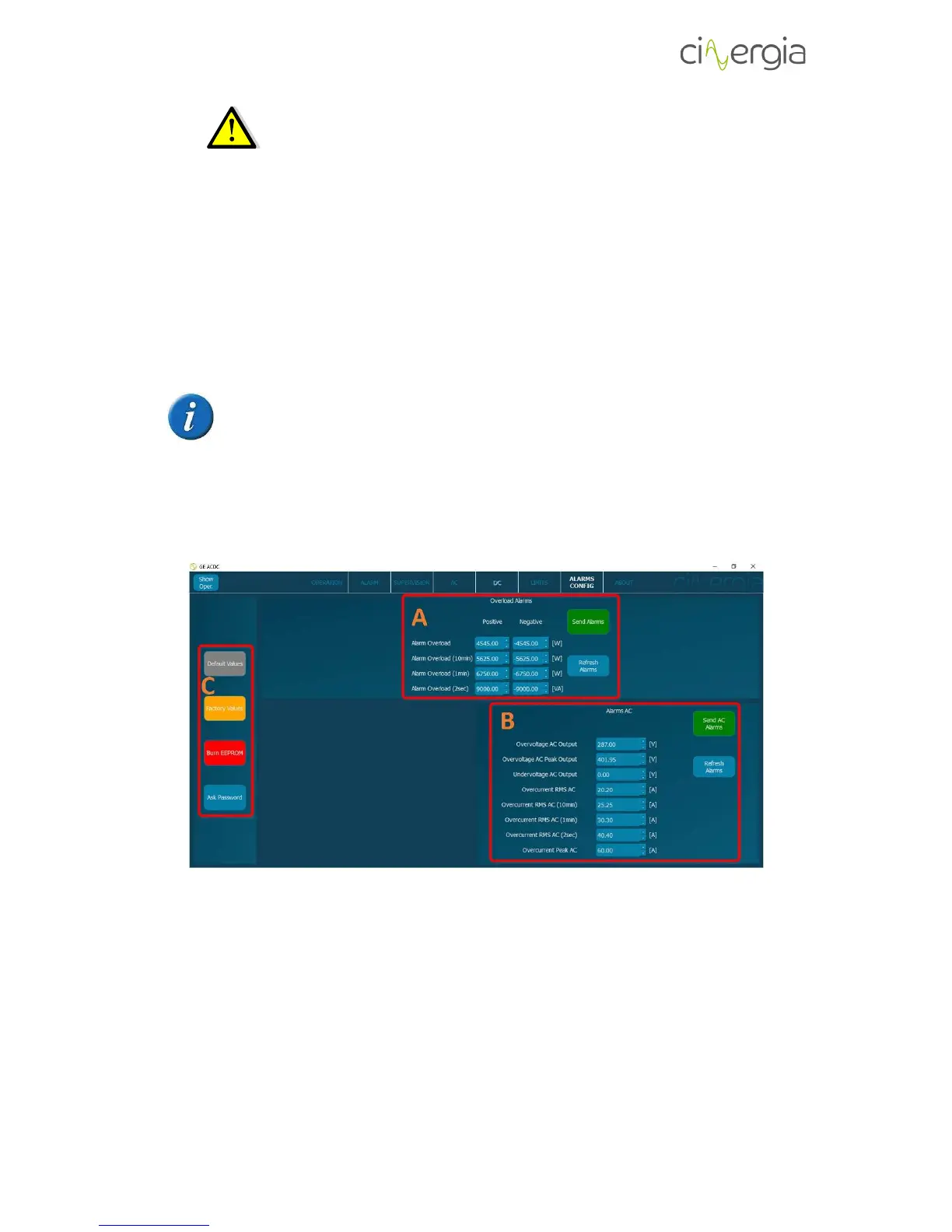 - B: Set the AC alarms and once the values are ready press Send AC Alarms button. If the