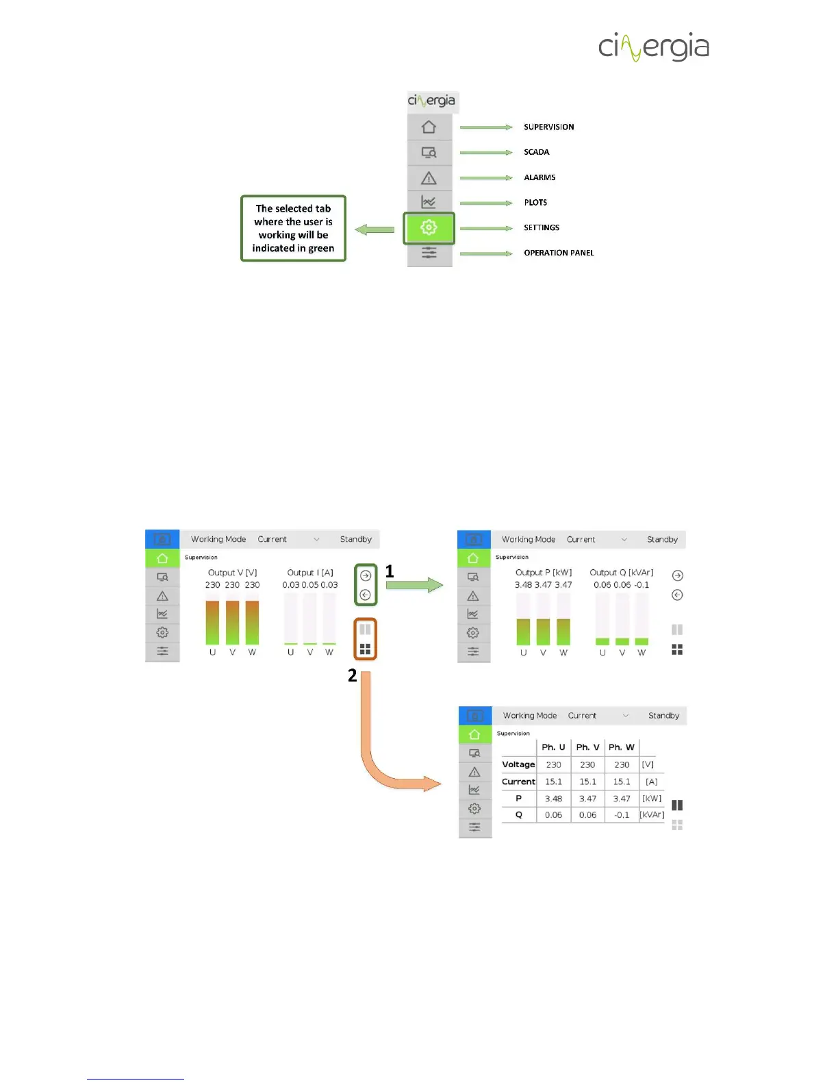Information tab. It shows the main variables of the inverter: voltage, current and power. You