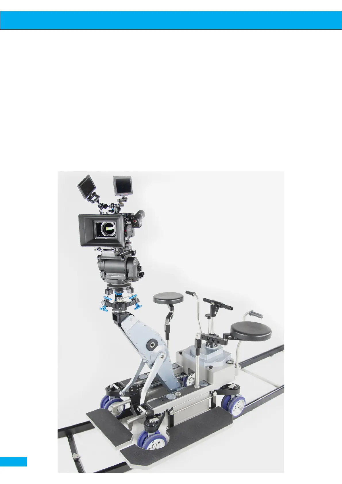 Albatross Dolly on track with standard accessories mounted. Levelling head maxi and camera mounted on the head