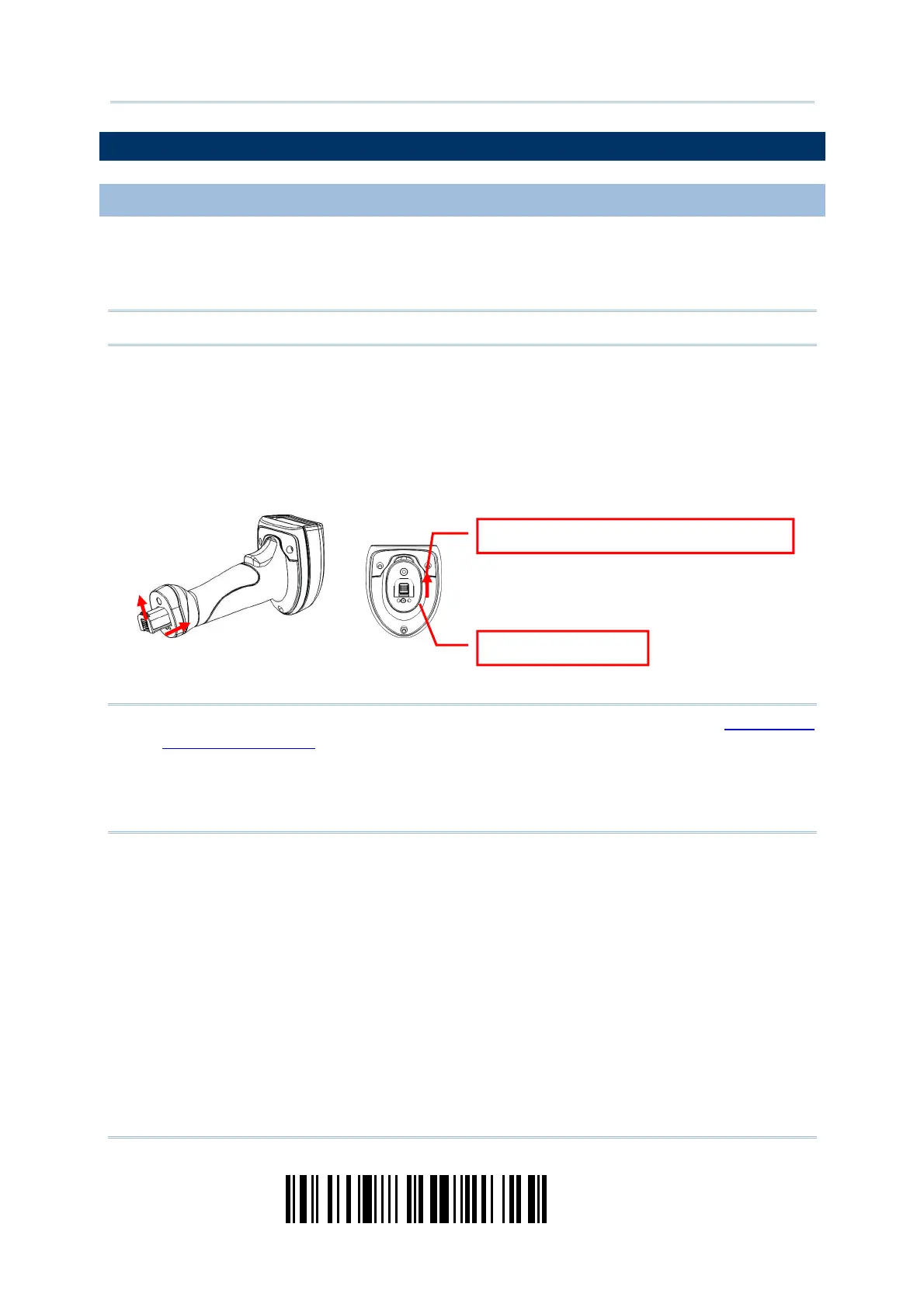 1) Hold the scanner still and insert the battery into the battery compartment at the
