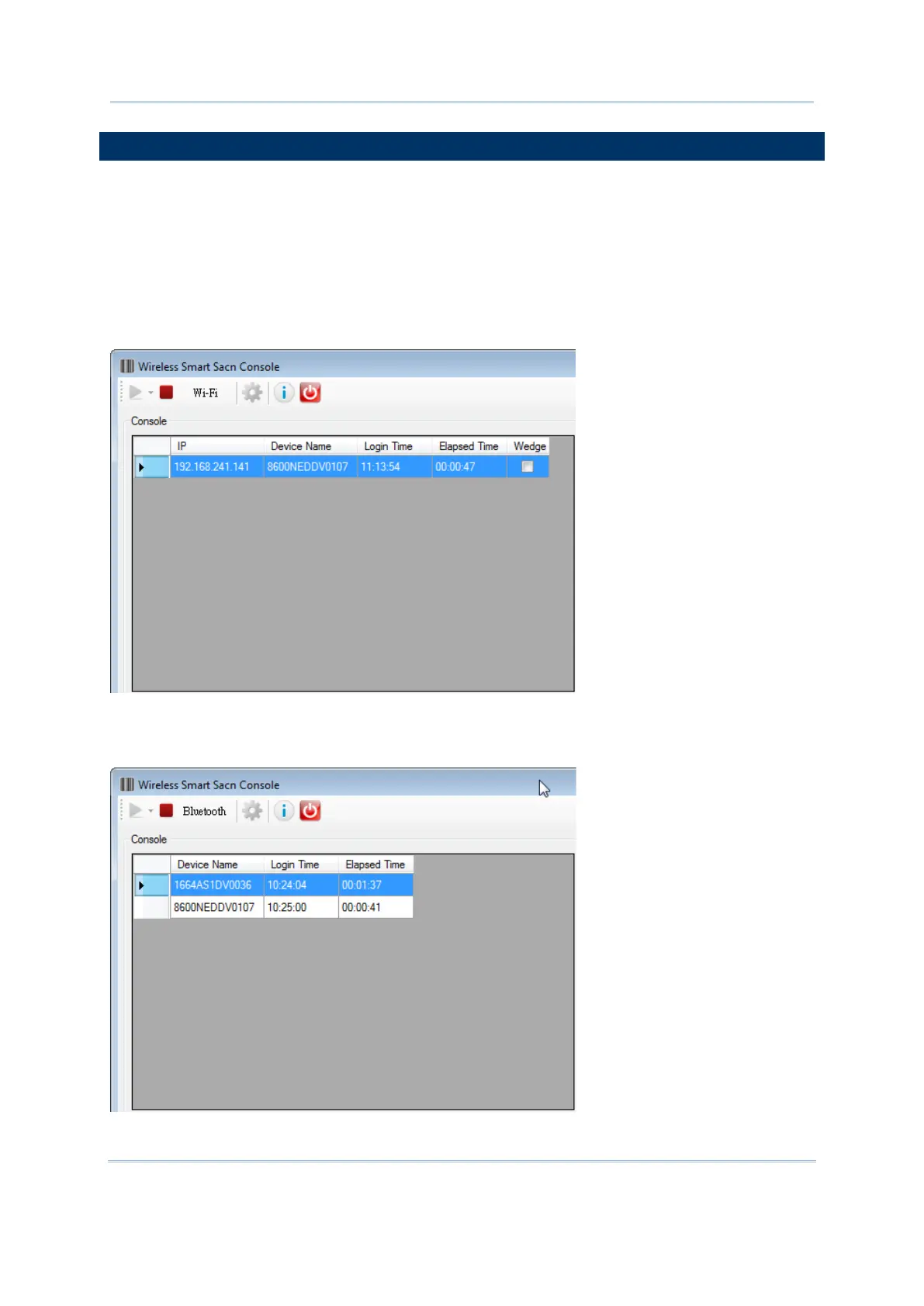 For Bluetooth connection, the Console area displays device name, login time, and elapsed