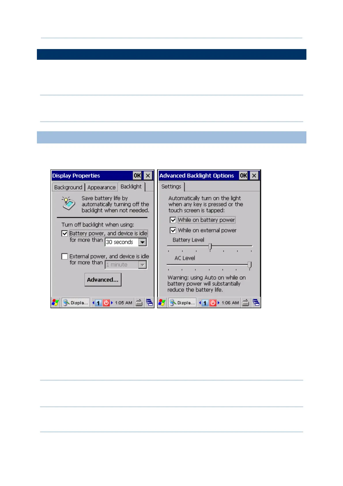 Warning: Using backlight while on battery power will substantially reduce battery