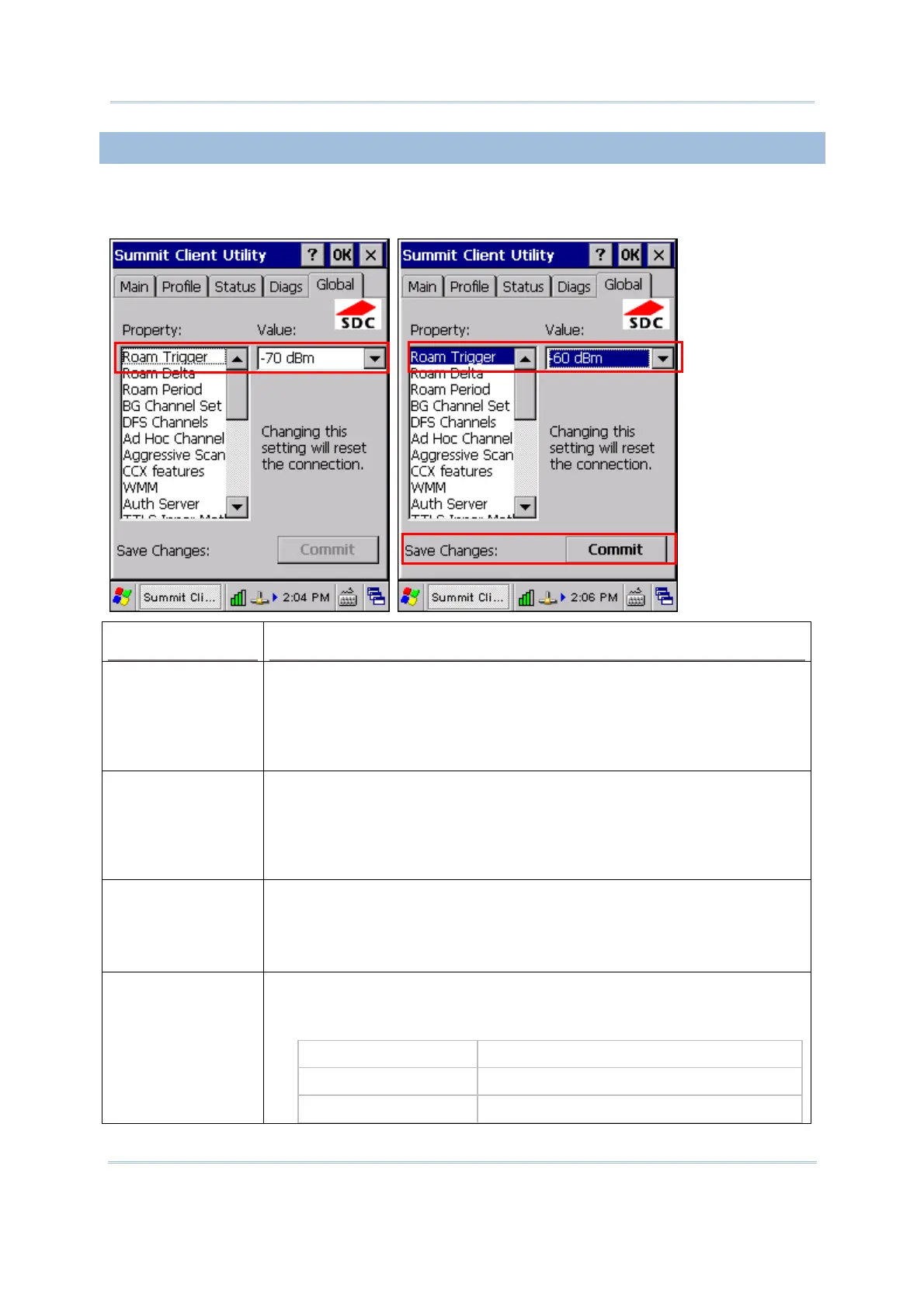 Roam Trigger When the moving average RSSI from the current AP is weaker than Roam