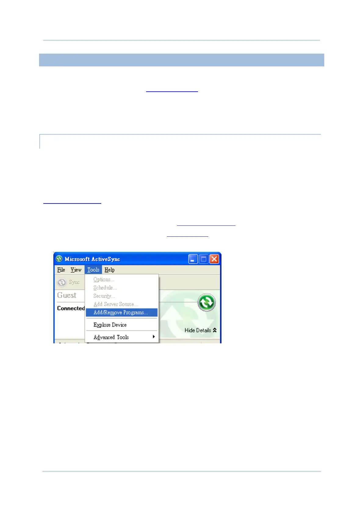 3) On the PC, from the menu bar of ActiveSync, select Tools | Add/Remove Programs.