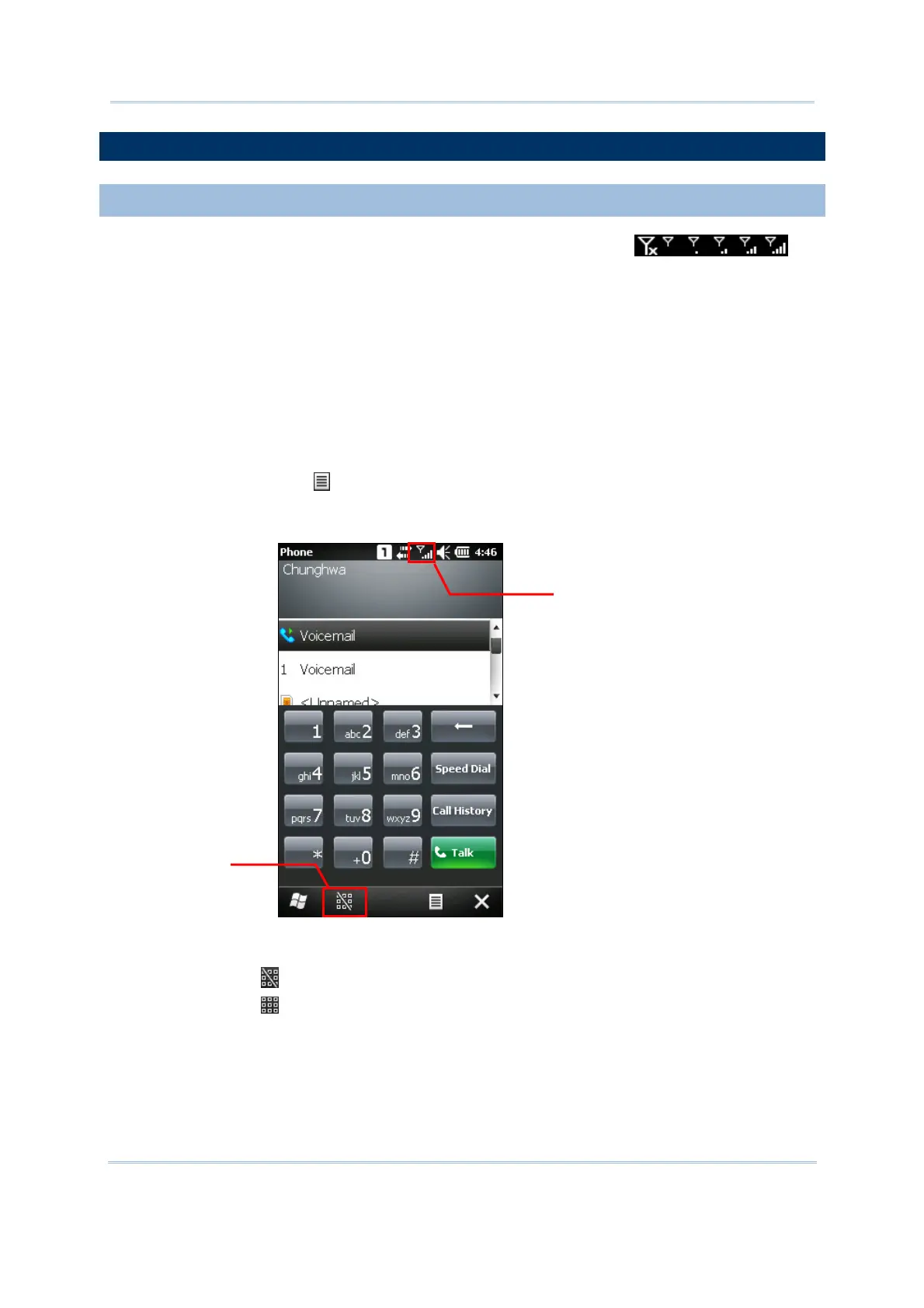 After the phone application is launched, the antenna signal icon on