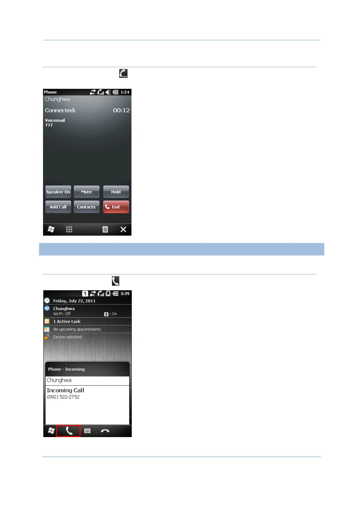 Tap the call status button on the soft key bar, and you may select to turn on the speaker,