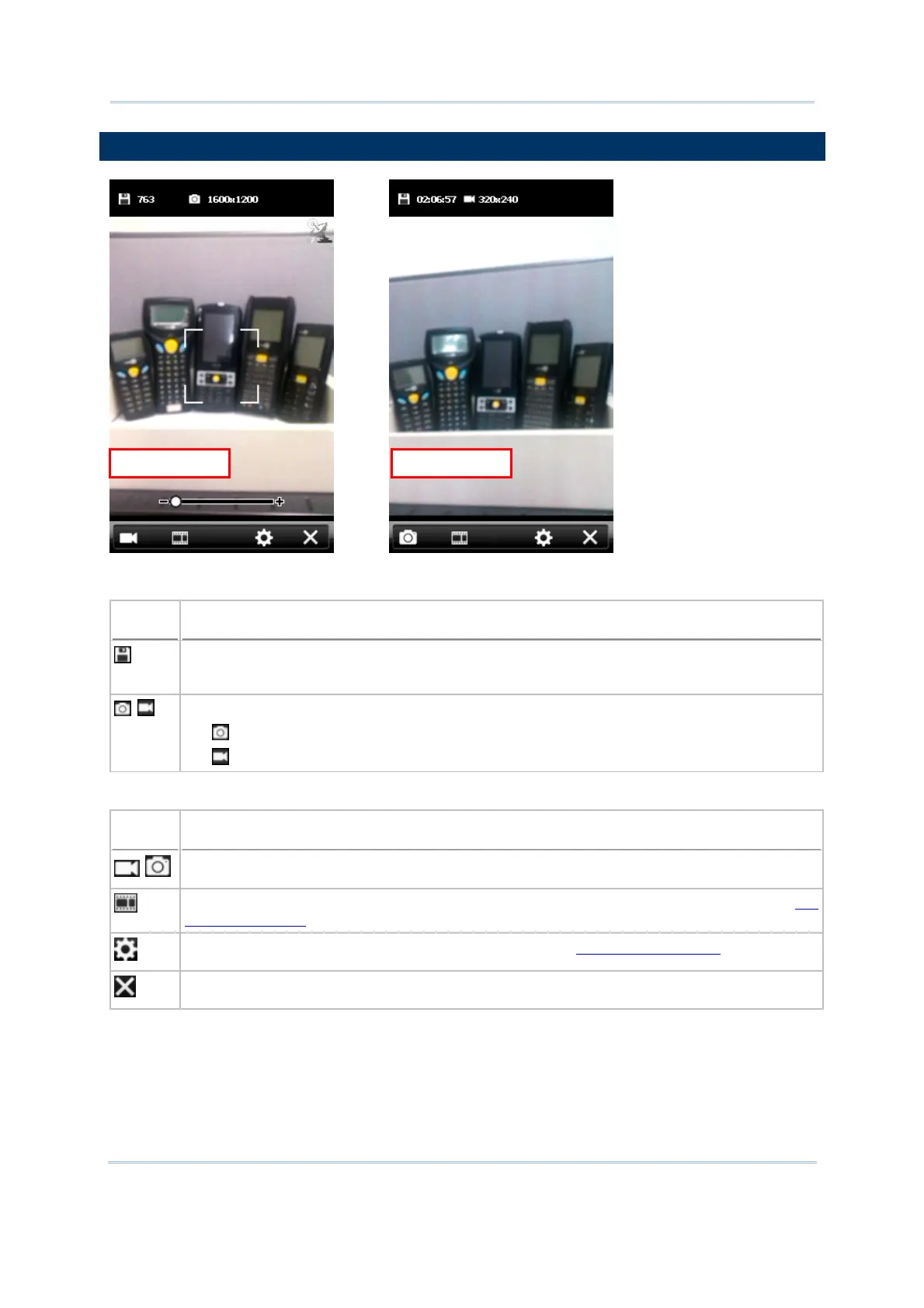 The icons on top of the screen are for camera status and image properties.