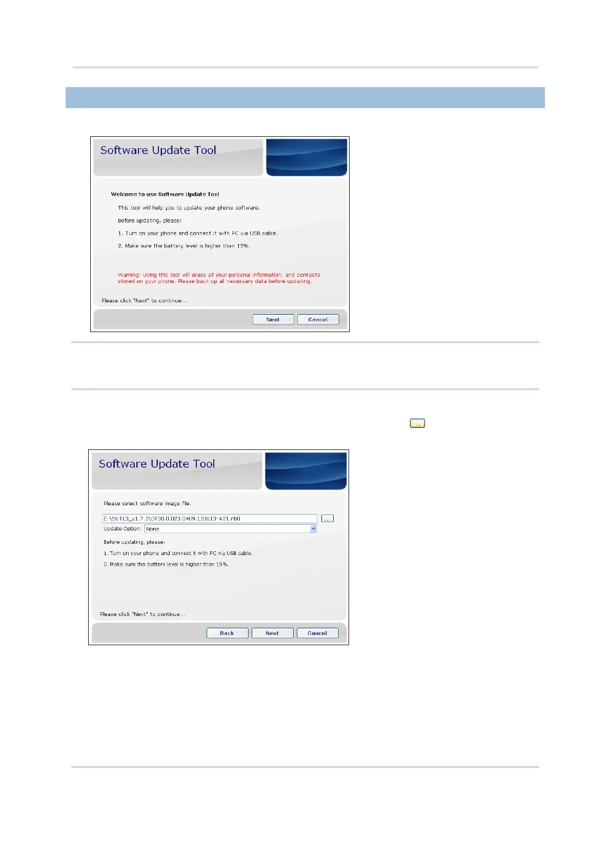 mobile phone during using Software Update Tool. Please back up all