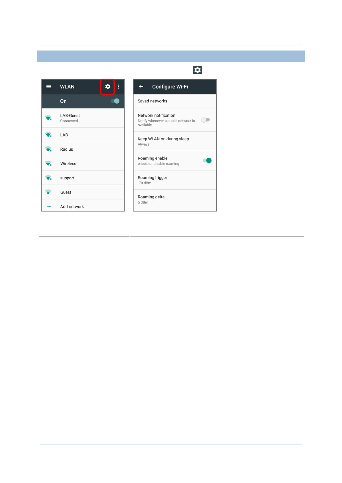 To configure Wi-Fi settings, please tap setting icon on the WLAN screen: