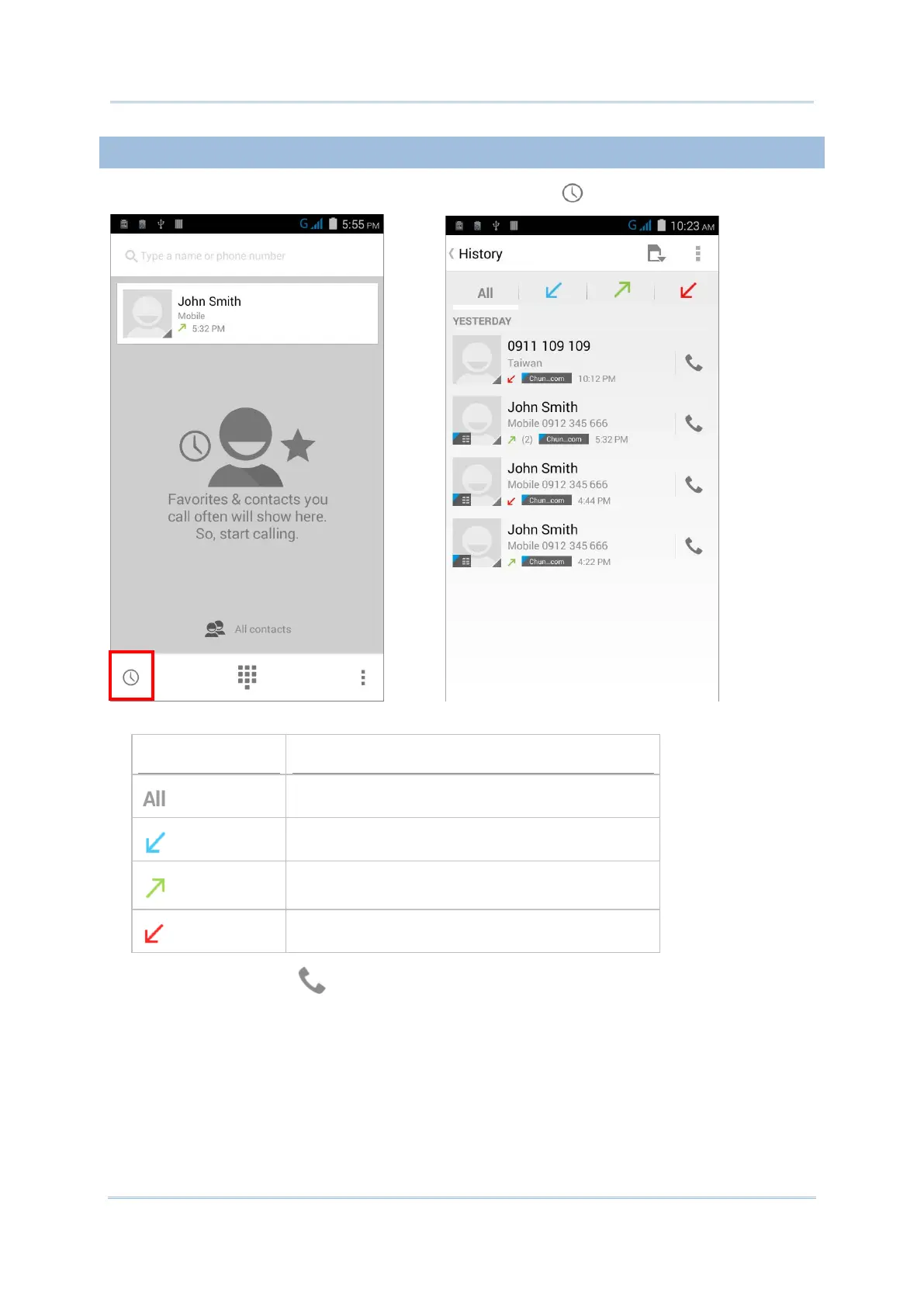 1) On the Phone application page, tap the History button to open a list of history calls.