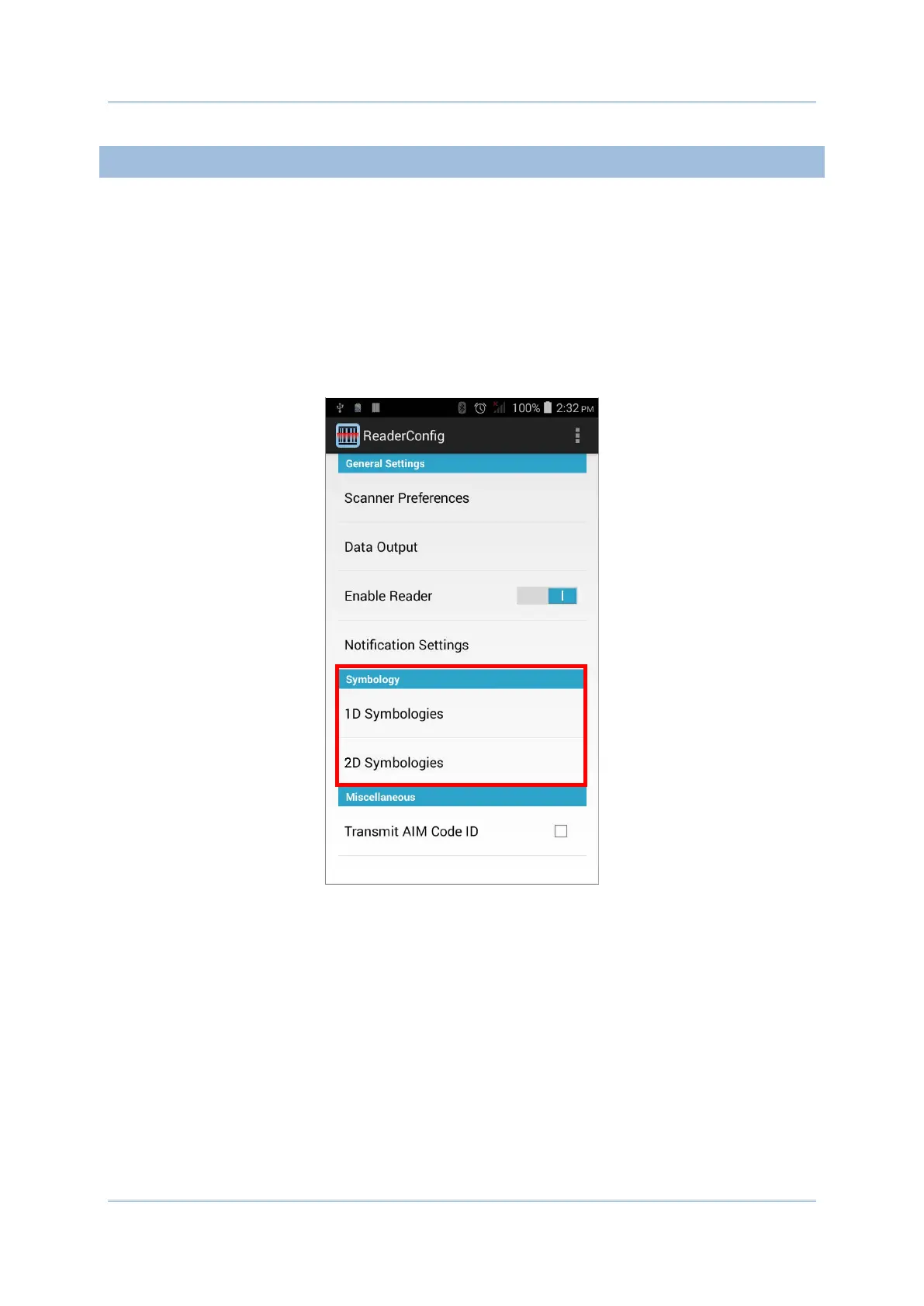 The Symbology page sets the symbologies to read, and also enables/disables some
