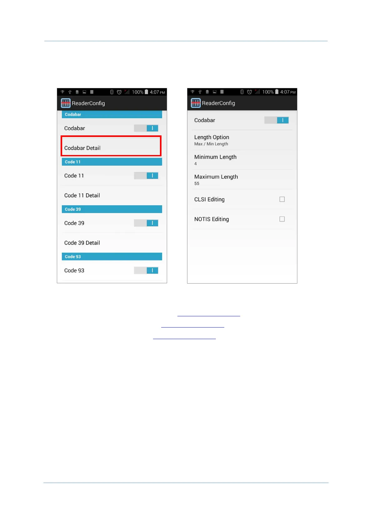 Tap the Detail label below each symbology to access detailed settings for the specific