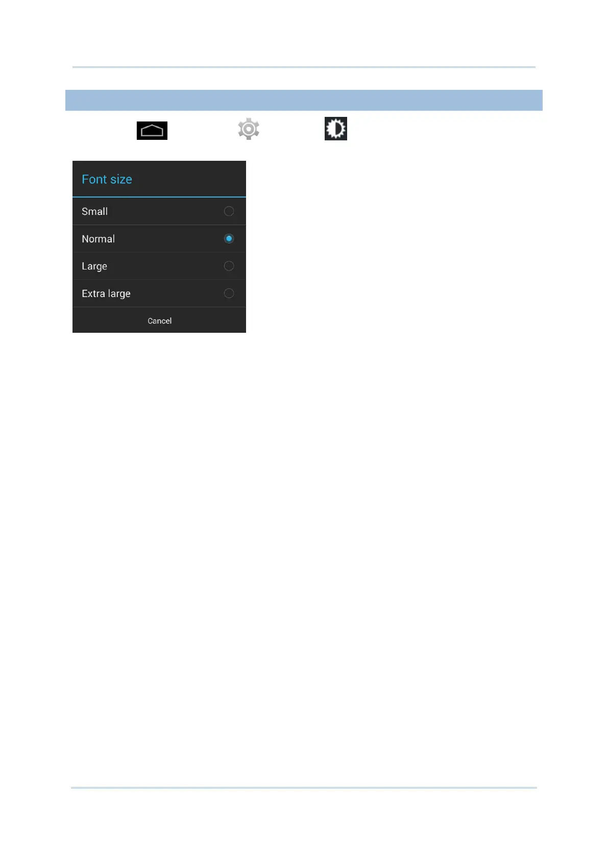 Tap Home | Settings | Display | Font Size. Select the font size