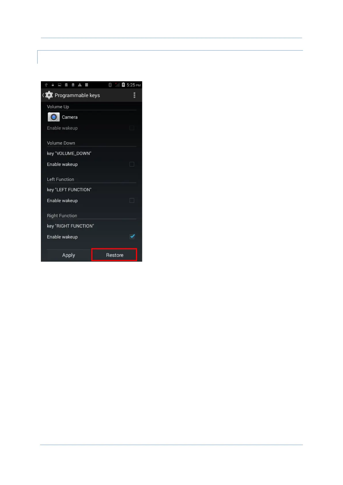To restore a key to its previously assigned function, tap the Restore button in the bottom