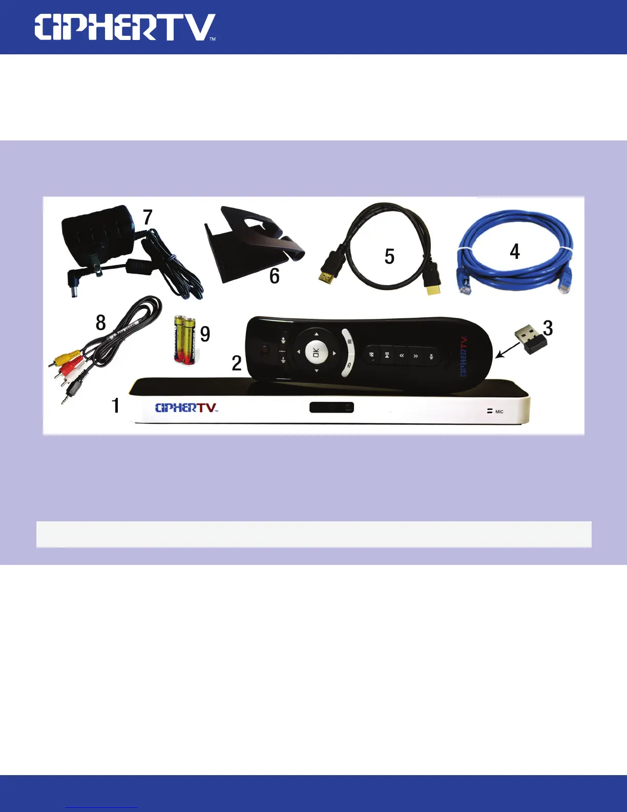 Infrared Remote, Micro-SD or TF card. For replacement parts visit www.ciphertv.com