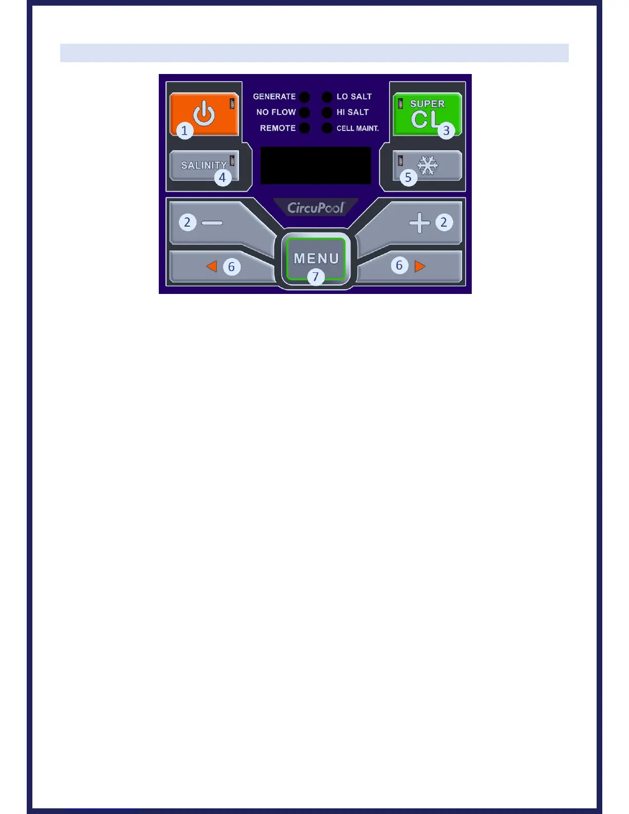 5) Winter Mode: Reduces the chosen Chlorine Output setting by half, for periods of low chlorine demand during