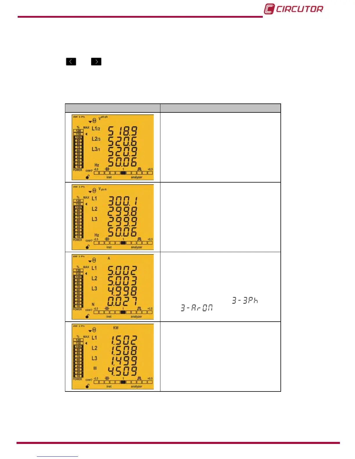 The device displays 11 different screens for the analyzer prole (Table 13) and the voltage and