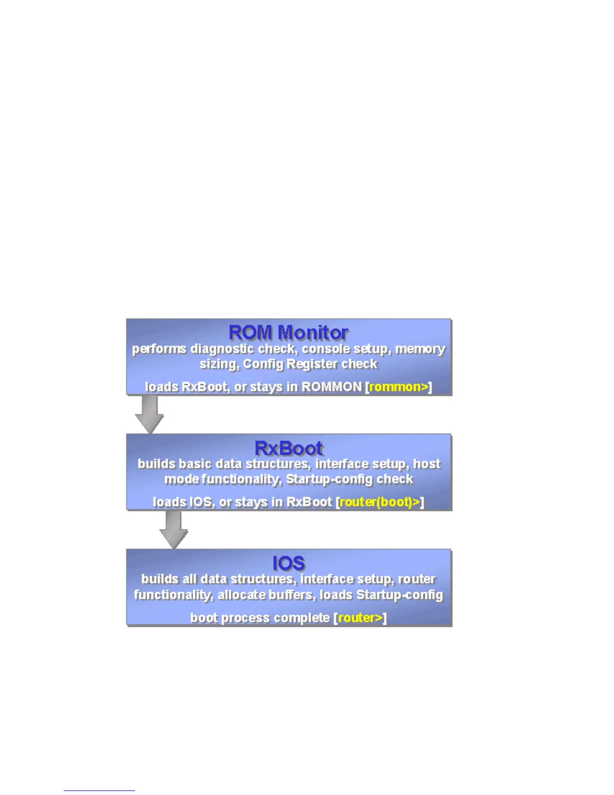 and loads the startup configuration. RxBoot also performs these functions, but it does not re−analyze