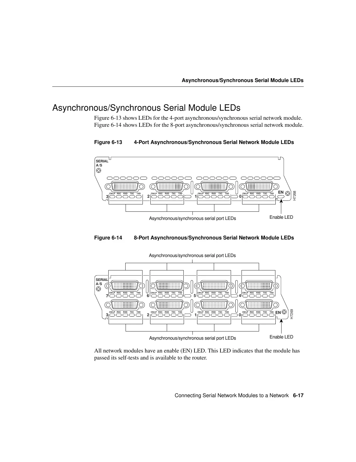 Figure 6-13 shows LEDs for the 4-port asynchronous/synchronous serial network module.