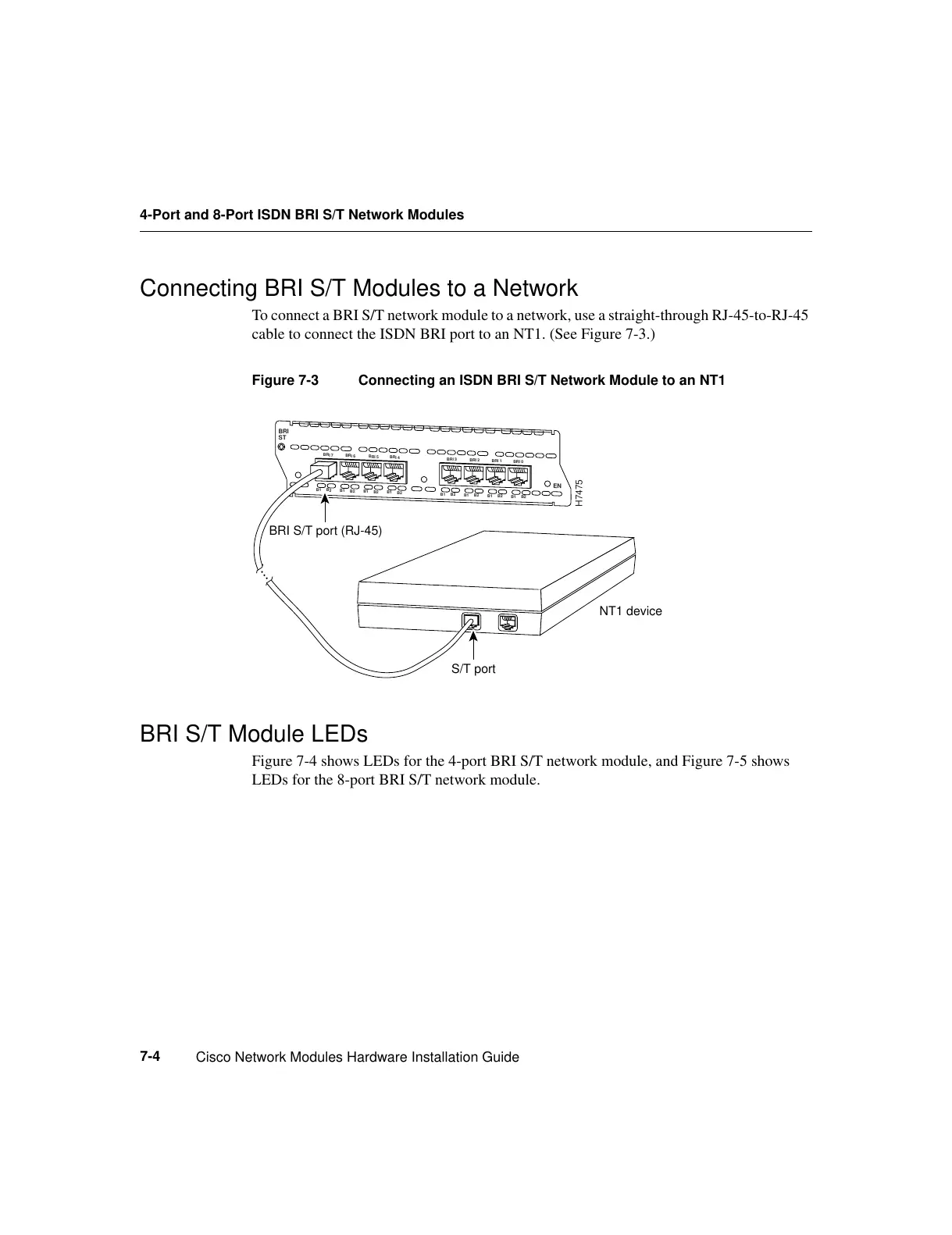 Figure 7-4 shows LEDs for the 4-port BRI S/T network module, and Figure 7-5 shows
