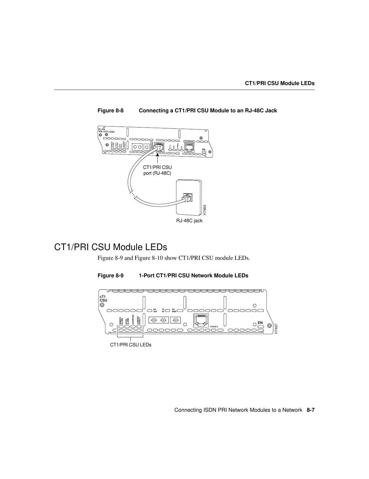 Figure 8-9 and Figure 8-10 show CT1/PRI CSU module LEDs.