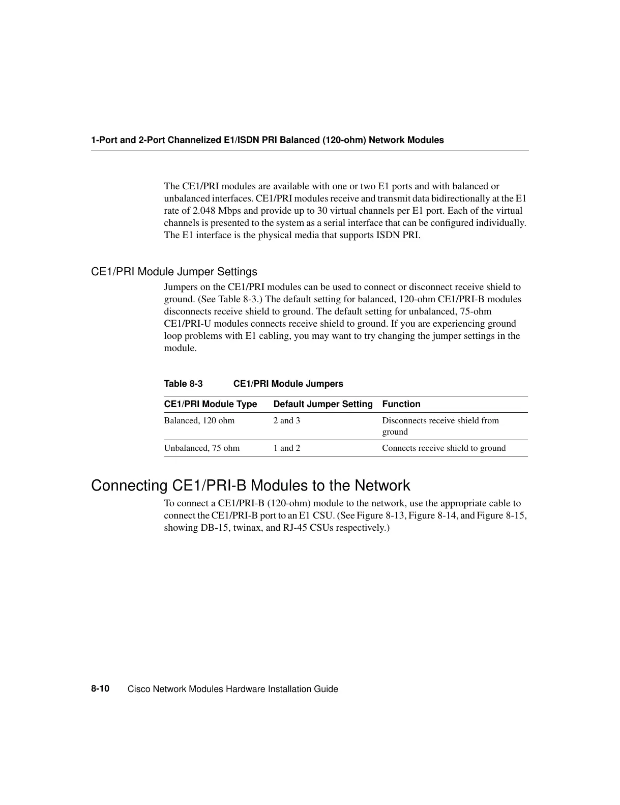 ground. (See Table 8-3.) The default setting for balanced, 120-ohm CE1/PRI-B modules