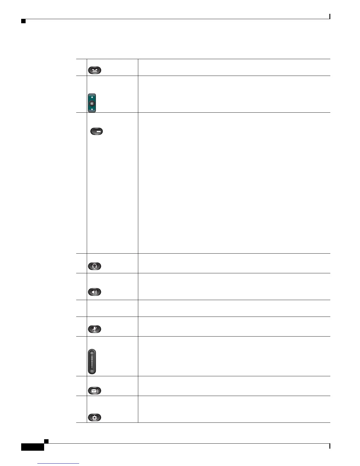 13 Volume button Controls the handset, headset, and speakerphone volume (off-hook) and the