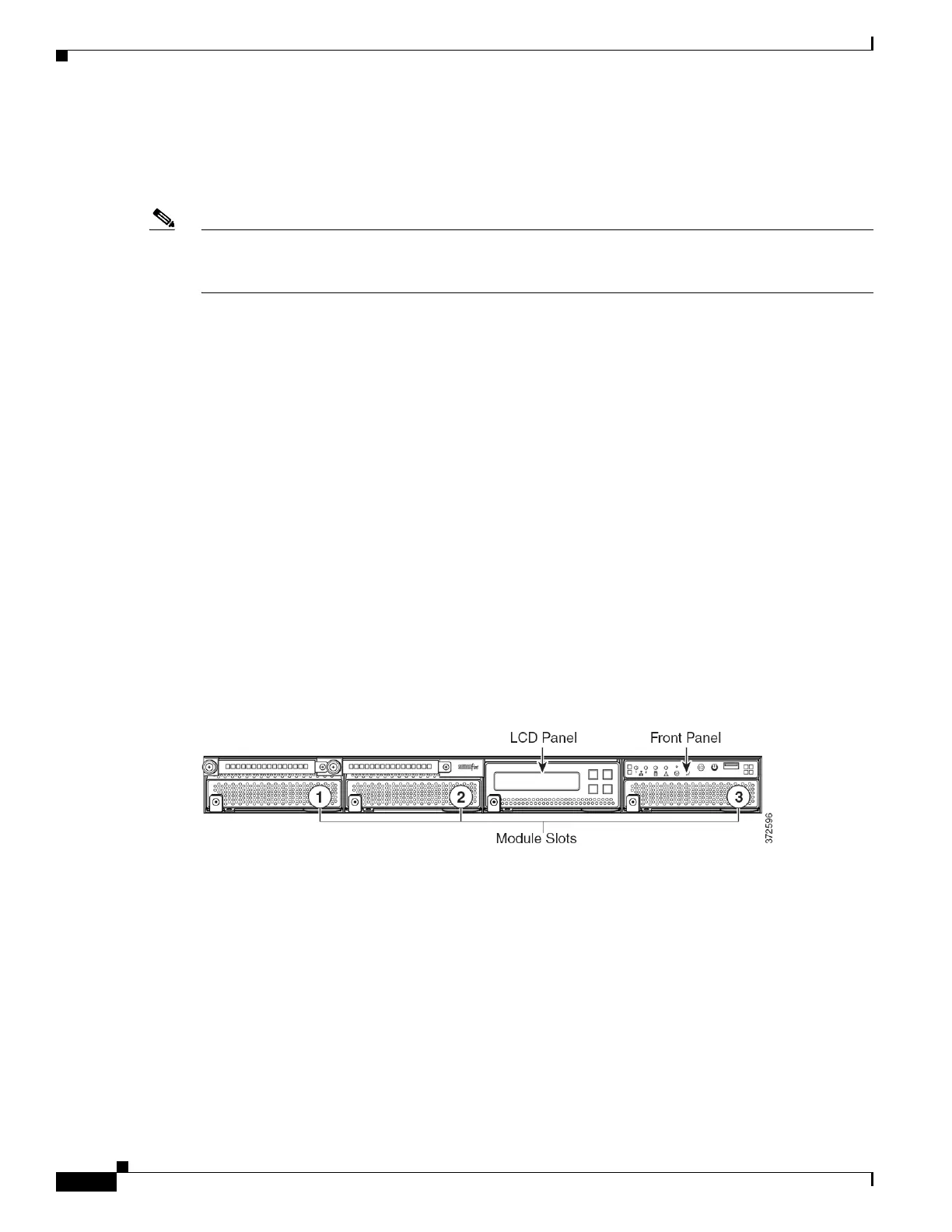 The front view of the chassis contains the LCD panel, front panel, and three module slots.