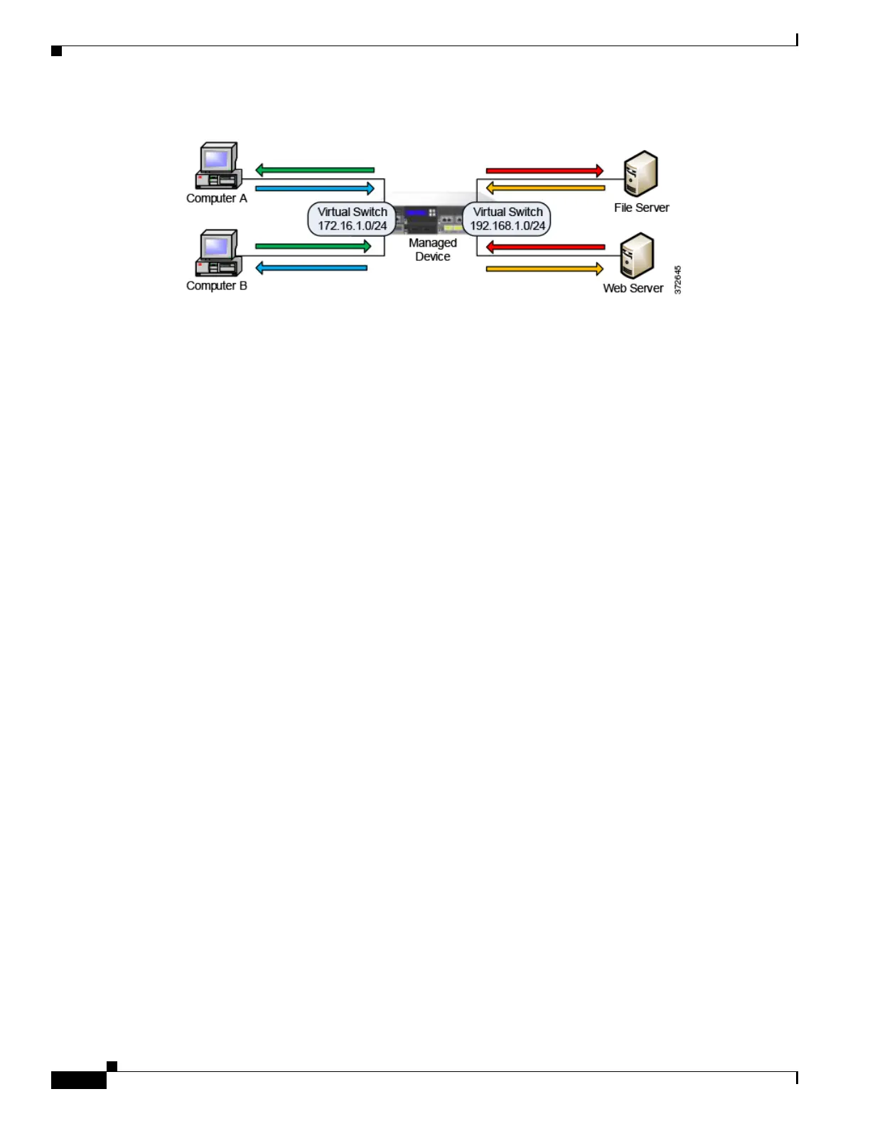 192.168.1.0/24. Although both networks are monitored by the same managed device, the virtual switch