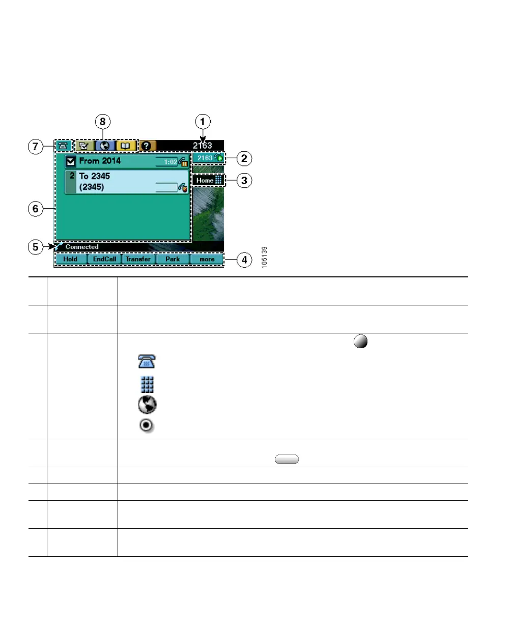 Call activity Displays your current calls per line, caller ID, call duration, and call state.
