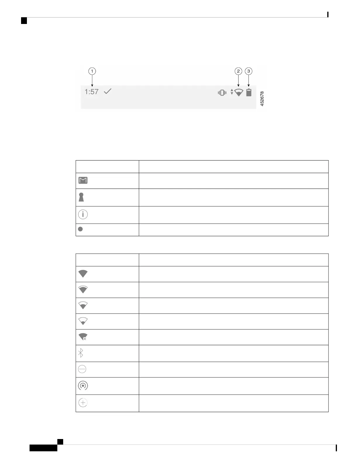 The status bar displays many icons. The following tables interpret some of these icons.