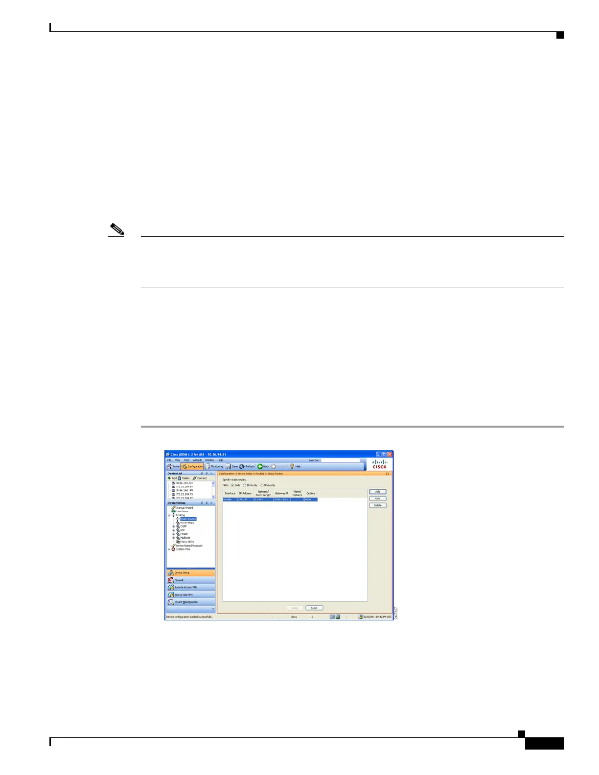Step 1 In the main ASDM window, choose Configuration > Device Setup > Routing > Static Routes.