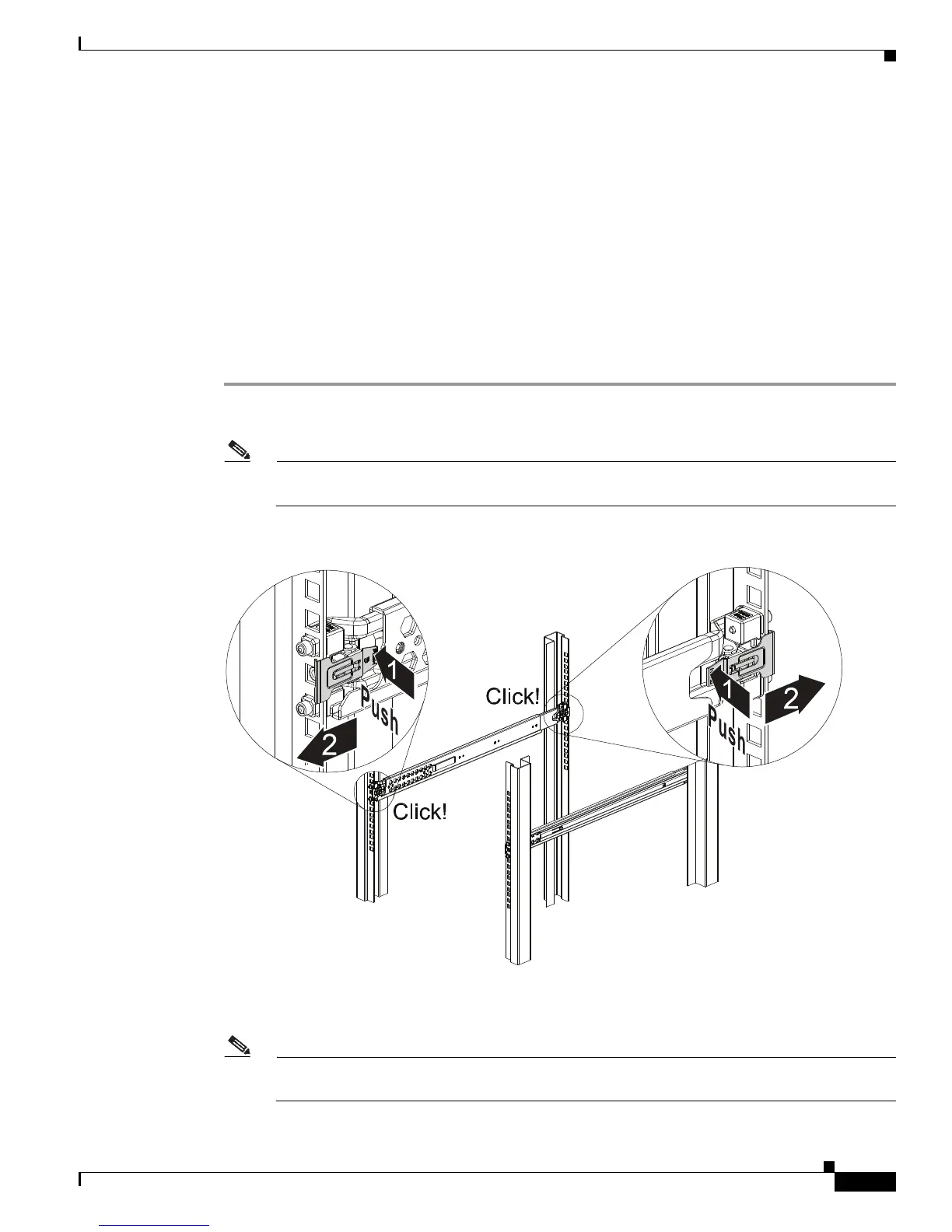 Step 1 Press the latch on the end of the slide rail and push forward to engage the pins in the rack until the clip