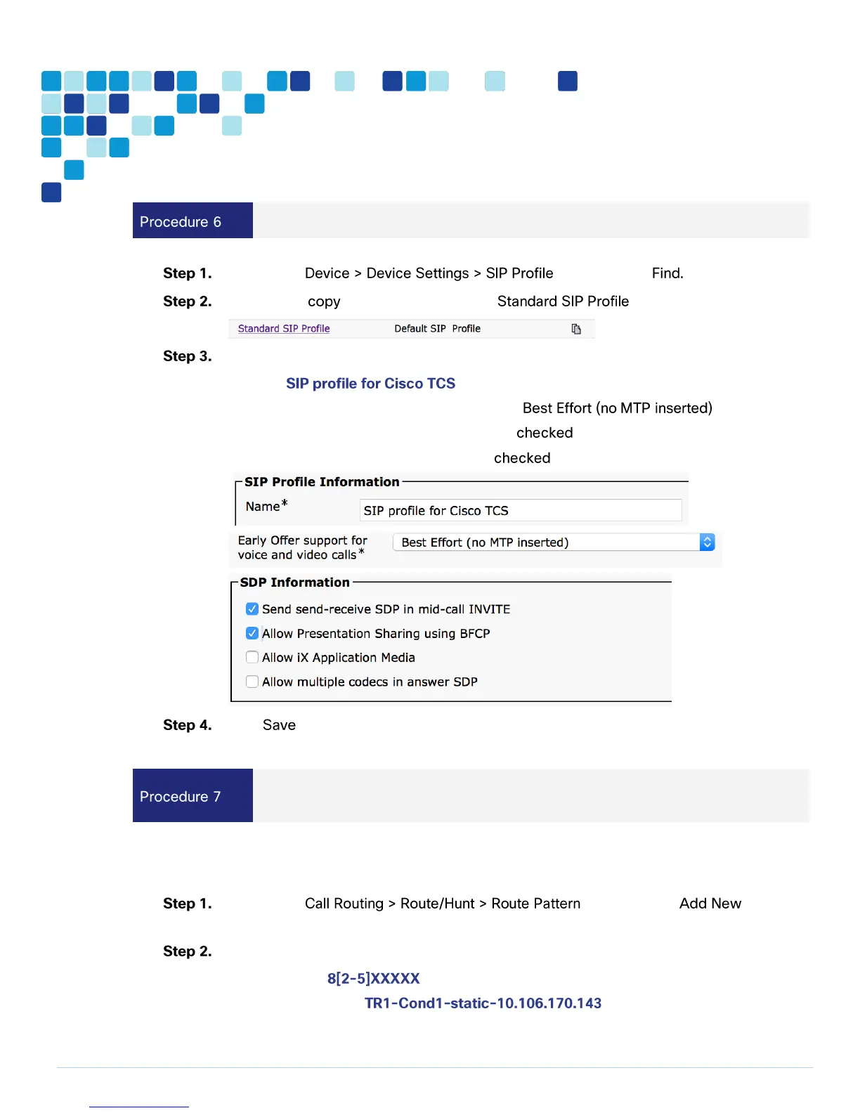 This procedure describes configuring the Unified CM route pattern to match the SIP trunk to TelePresence