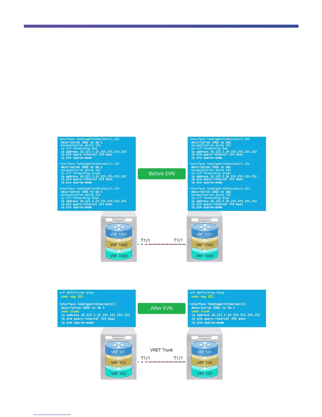 Figures 16 and 17 show the benefit of using EVN in a VRF-Lite environment.