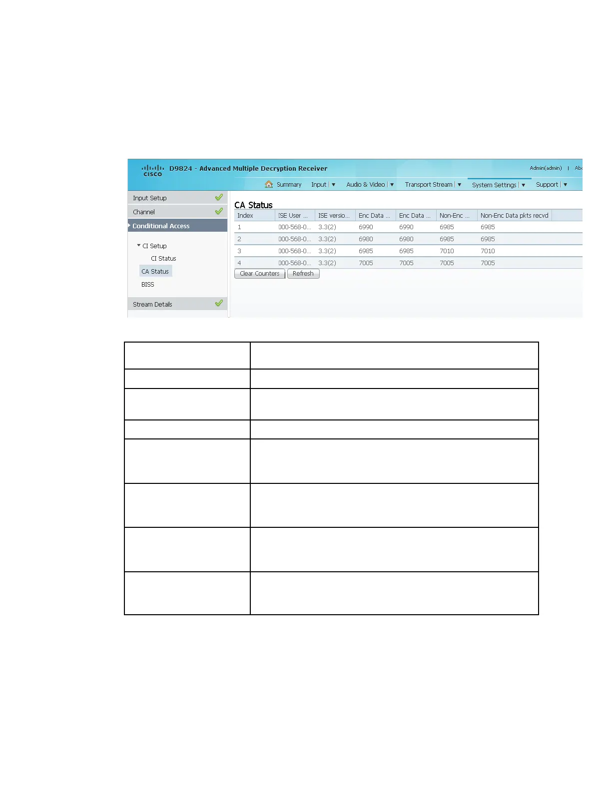 From the user interface of the D9824, choose Input > CA Status. The CA Status page