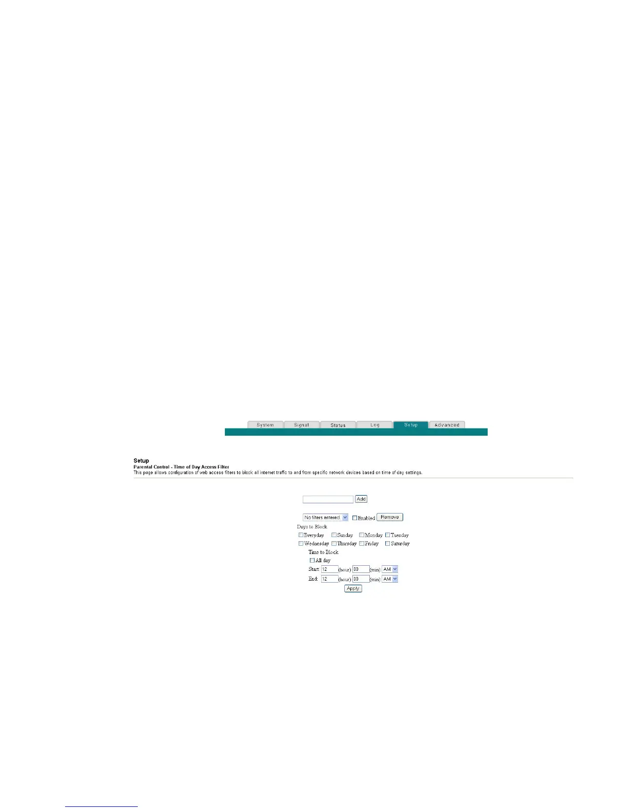 Use the Setup Parental Control - Time of Day Access Filter page to configure web