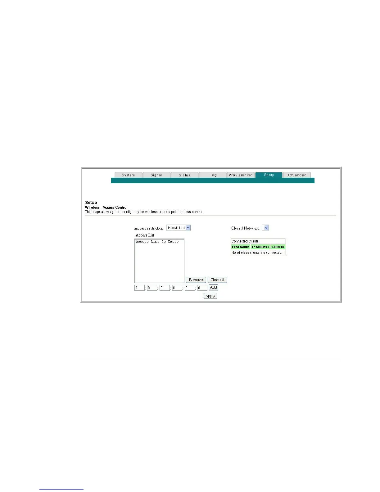 The following illustration is an example of the Setup Wireless - Access Control page.