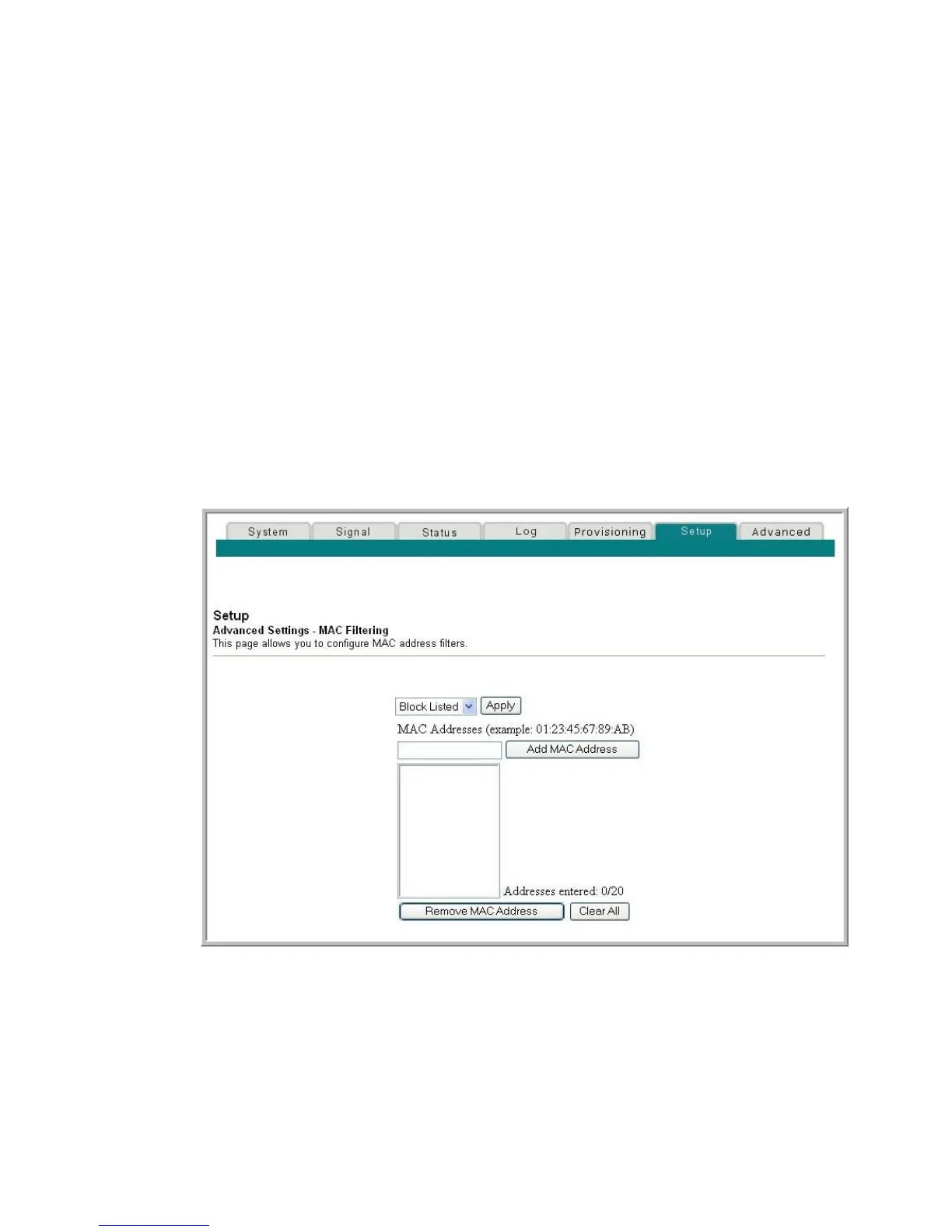 Use the Setup Advanced Settings - MAC Filtering page to configure MAC address