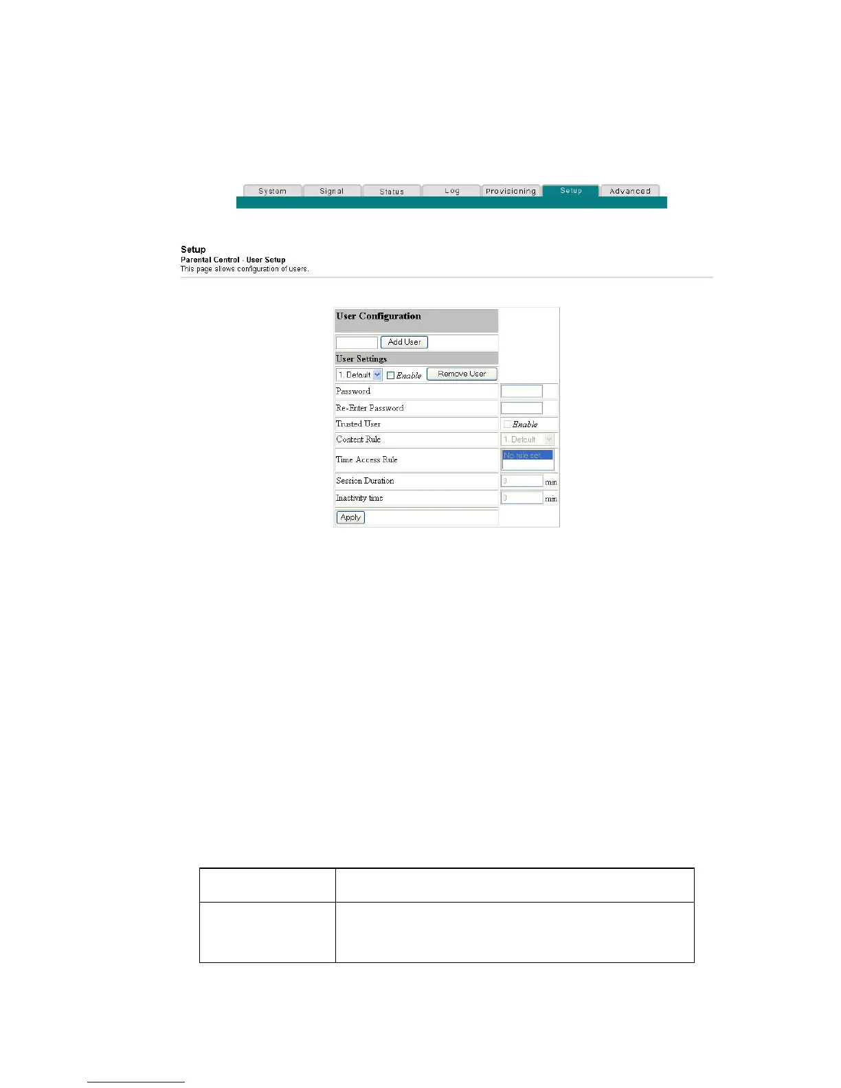 Setup Parental Control - User Setup Page Description